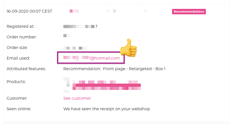 Under the specific order, you can see the data tracked, and it should include the email address of the customer. If not, there might be an issue with conversion tracking. You can contact the Hello Retail support, and we will figure out what could be wrong.