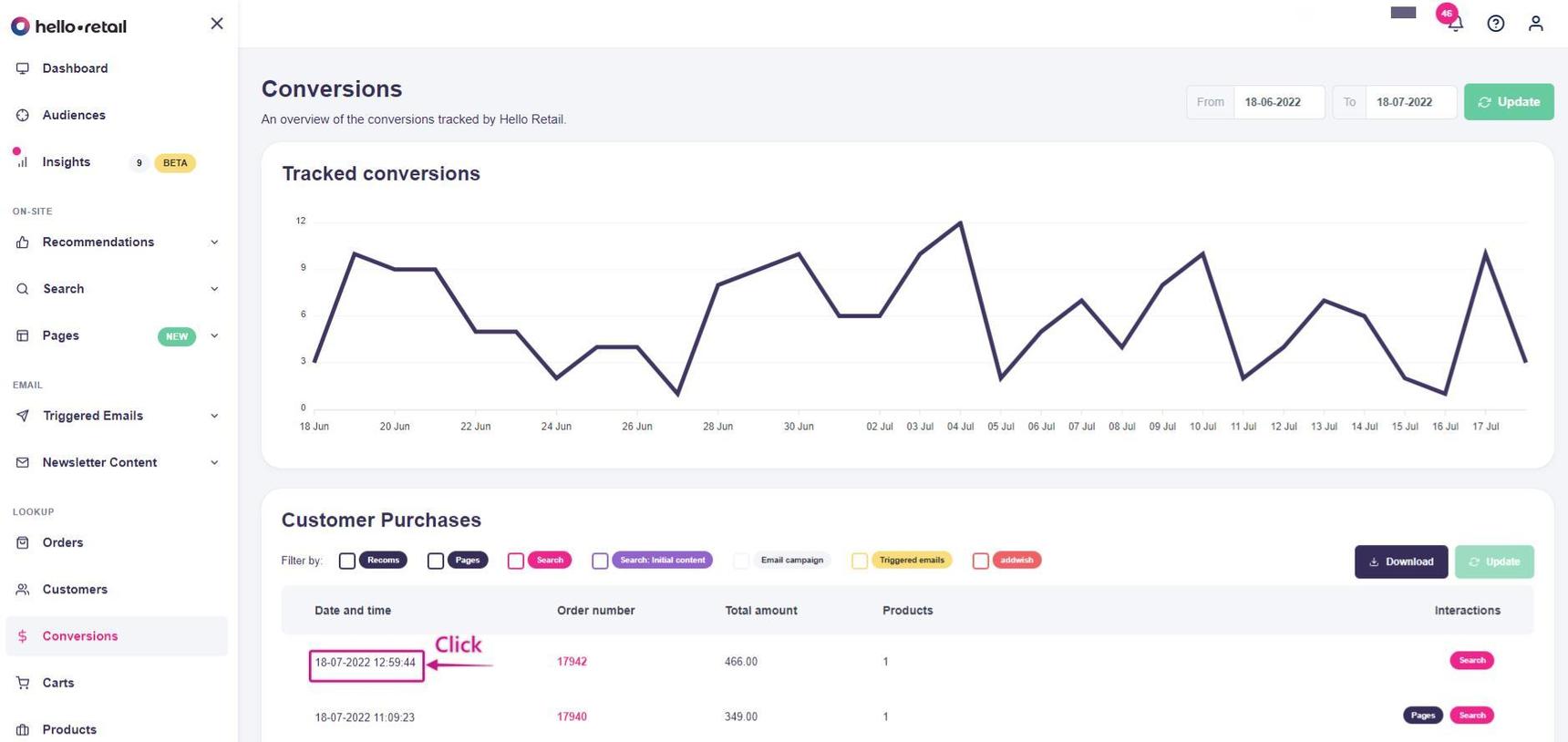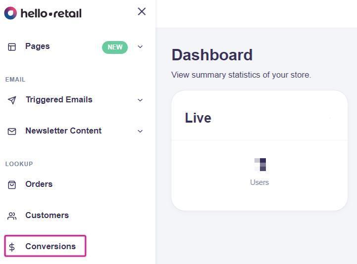 One way to check if you are tracking conversion data correctly is to log into your Hello Retail account and click Conversions.