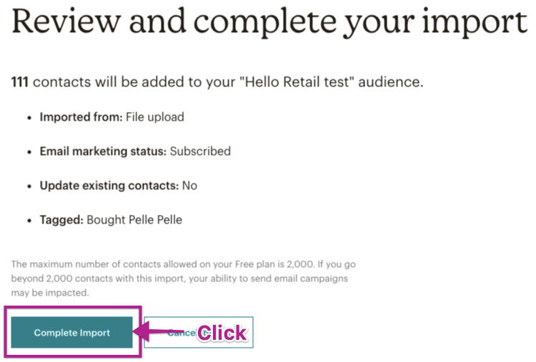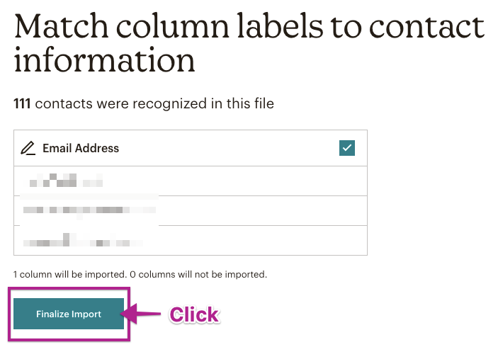 Now you'll see a short example of what is being uploaded and under what label in Mailchimp the data will be stored. Mailchimp will automatically recognize the data as email addresses. Click Finalize Import.