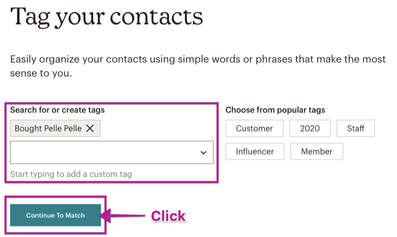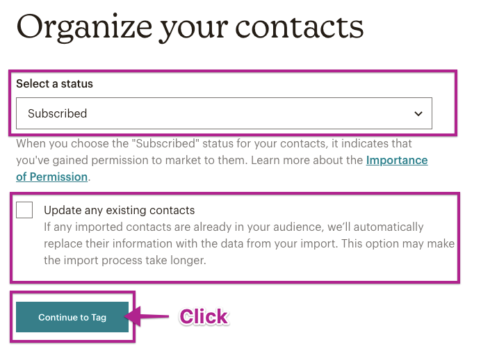 Under Organize, you can choose the status of the imported customers. As the imported list consists of customers with permission, you can select Subscribed. Leave the Update any existing contacts unchecked as we are not adding any new information - we are just compiling a list of already known customer emails. Click Continue to Tag.