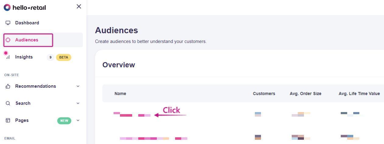 To download the list of emails, first, locate the Audience you want to reach. Log into your Hello Retail account -> click Audience -> click the Name of the Audience.