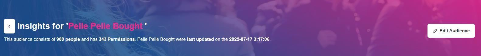 You are now presented with all the insights available for this particular Audience. At the top of the page, you can see how many customers are in the Audience and from how many of these you are permitted to contact. In this example, we are looking at an Audience that bought products from the brand Pelle Pelle. There are 980 customers, and we are allowed to contact 343 of them - quite a fair ratio, but one can improve it. We talk a bit about how to obtain more permissions here.