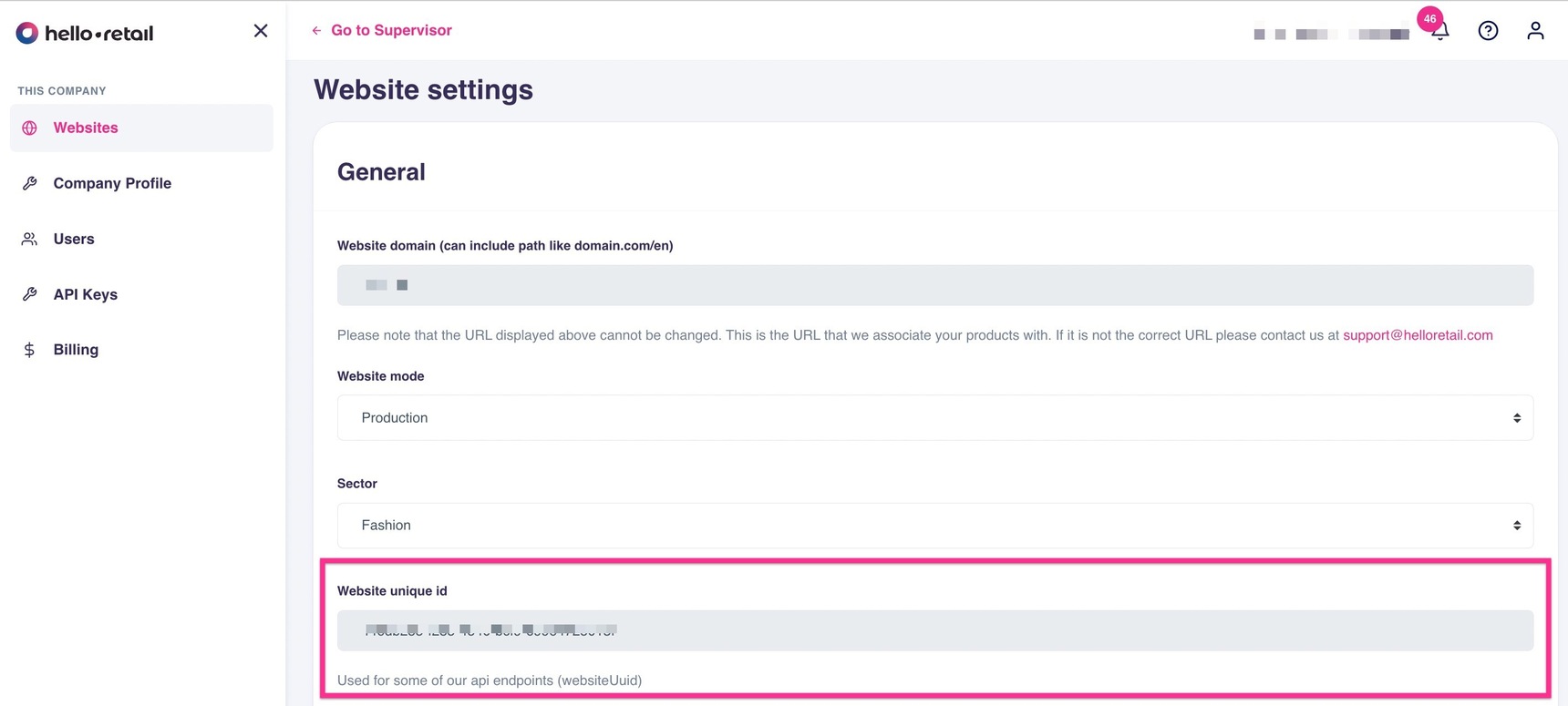 In the context of either calling the Hello Retail API or scheduling feedruns in Hello Retail, you will be required to know either the UUID of your website(s) or to create an API-key. Both of these values are available in the dashboard:
