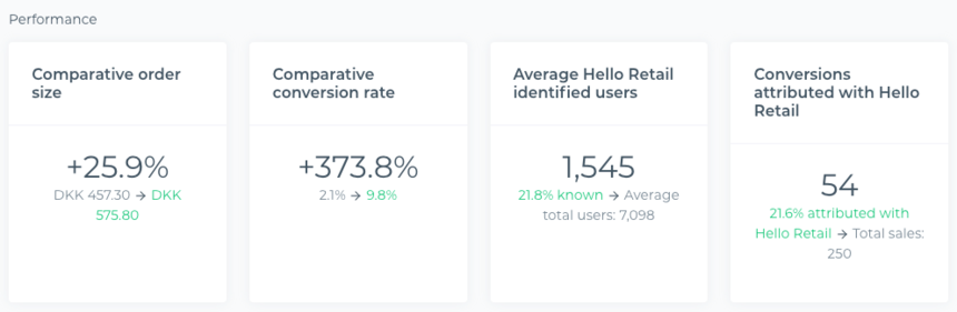 Through the statistics in the first box, you will see how the order size of customers who are not interacting with Hello Retail features compares to those how are. In the example above, the average order size is 25% larger when the customer interacts with Hello Retail on the shop—from 457.30 to 575.80 DKK. Of course, this varies a lot from shop to shop but generally, Hello Retail users see a significant difference in order size.