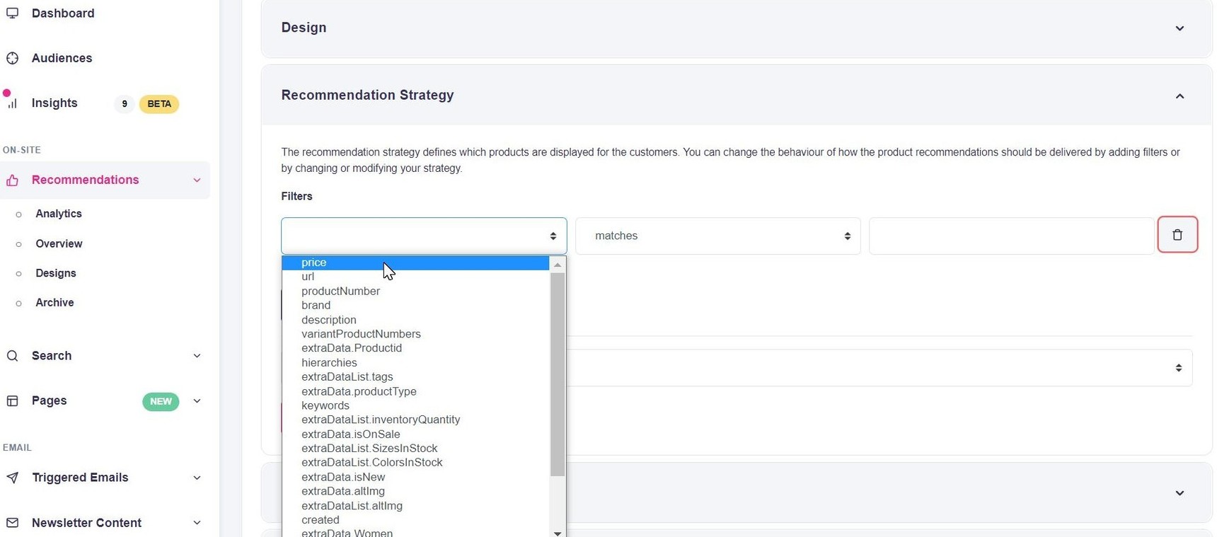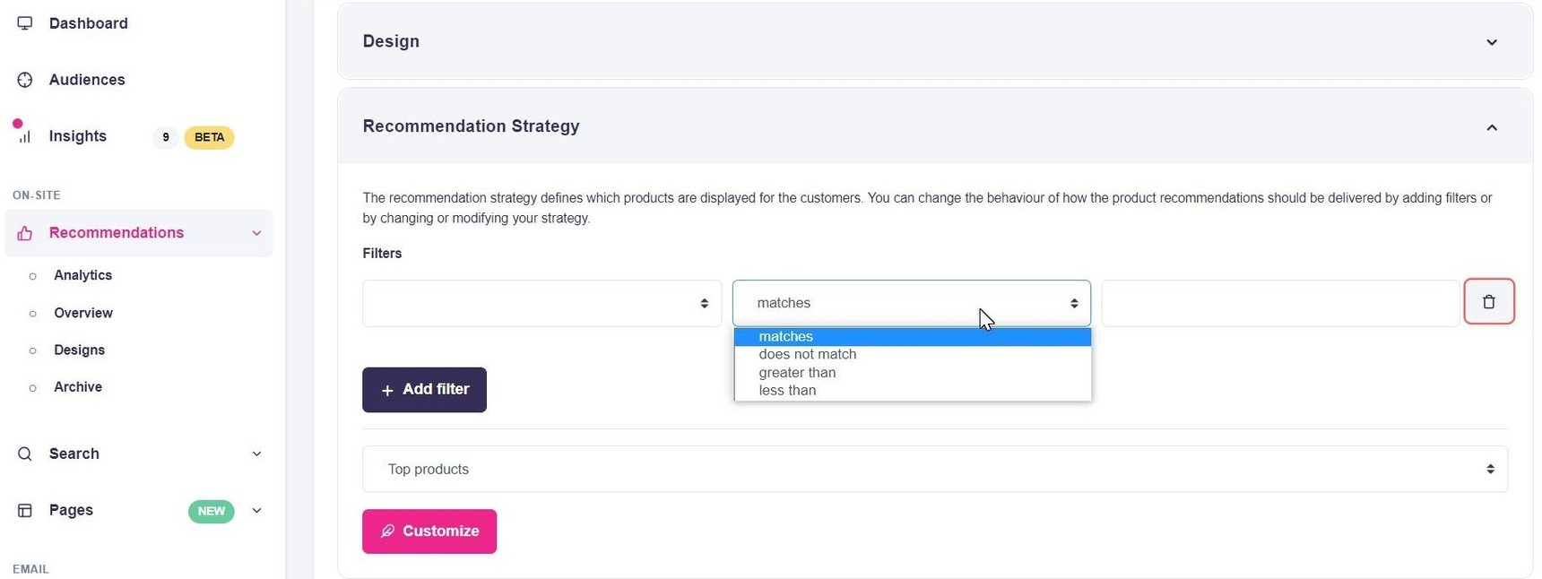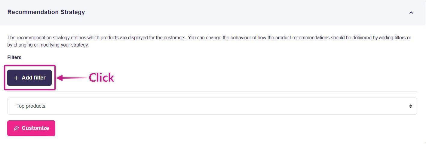 3. You will see a few options for configuring the recommendations. Scroll down to the box named Recommendation strategy to unfold it and click on the Add filter button.
