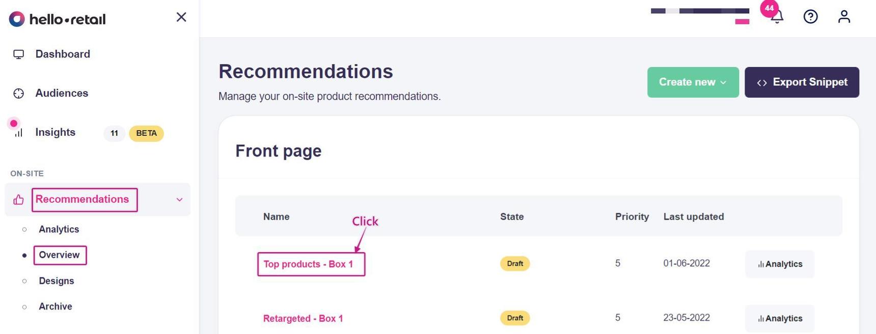 - Start by logging into your Hello Retail account. On the dashboard view, navigate to the left-hand side menu. Under the Recommendations section, click on Recommendations to unfold the drop-down menu.