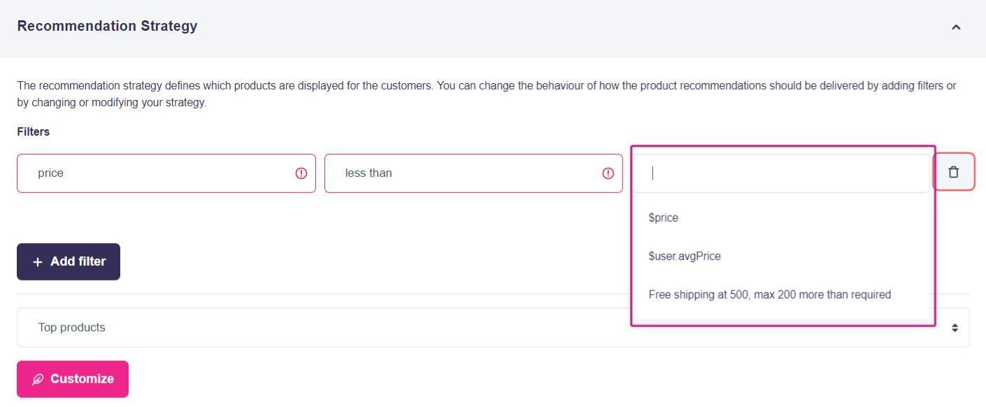 In the last field, we define the price that the recommended product prices should be less than. This could, for example, be 200DKK. The filter will look like this: