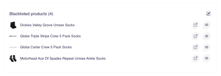 Once blacklisted, the product will no longer appear in recommendations for the selected product.