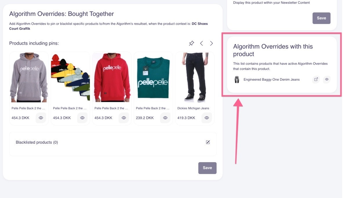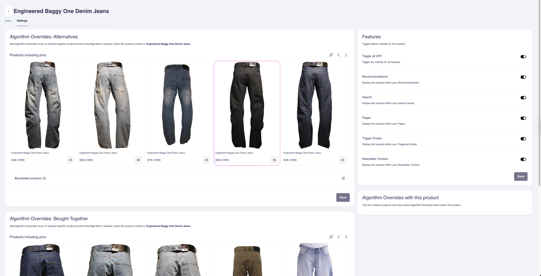 At the bottom of the product’s settings, you’ll see a list of Algorithm Overrides with this product.