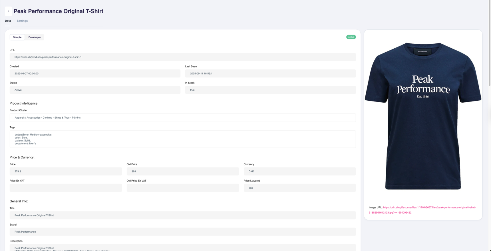 For making use of a lot of the Features within Hello Retail it is additionally important that you provide a description and an image for your product, as this will help to automatically assign the different values for tags and product clusters. The better the data for input here, the better the result is.
