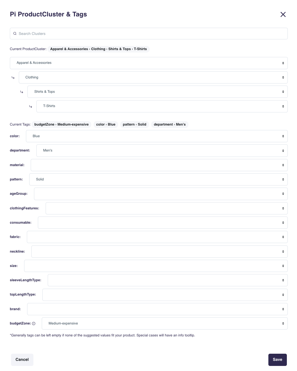 Edit or add tags like color, size, fabric, fit, age group, or budget zone.