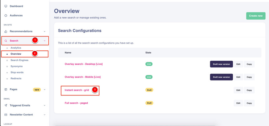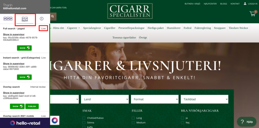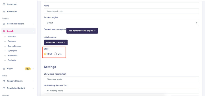 - Start by logging into your Hello Retail account. On the dashboard view, navigate to the left-hand side menu. Under the On-Site section, click on Search to unfold the drop-down menu.