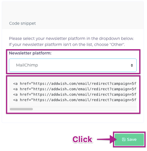 This code snippet has to be added to the newsletter in an HTML block which is generally easy depending on your newsletter provider. Click Save to save the campaign.