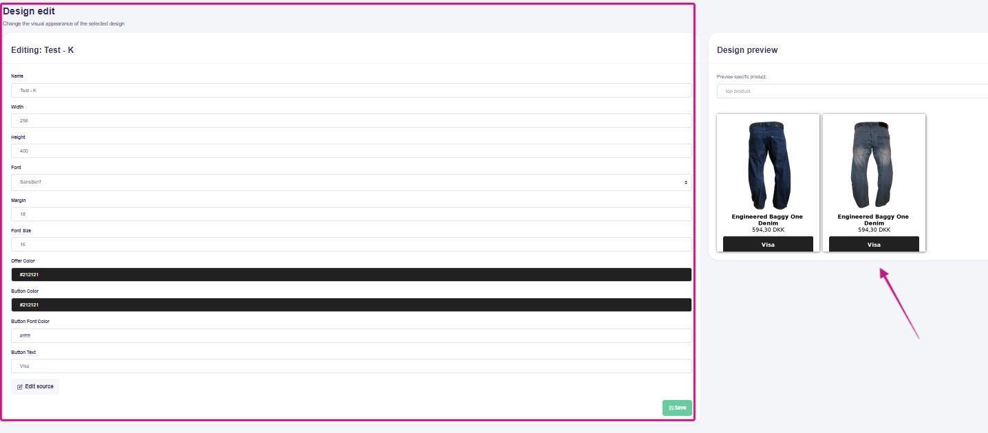 5. Next, you can configure the design of the product recommendation view. You can control attributes like width, height, the font, font-sizes and highlight colours.