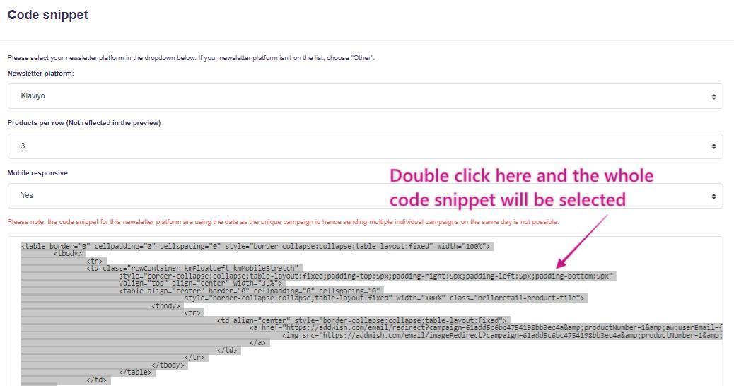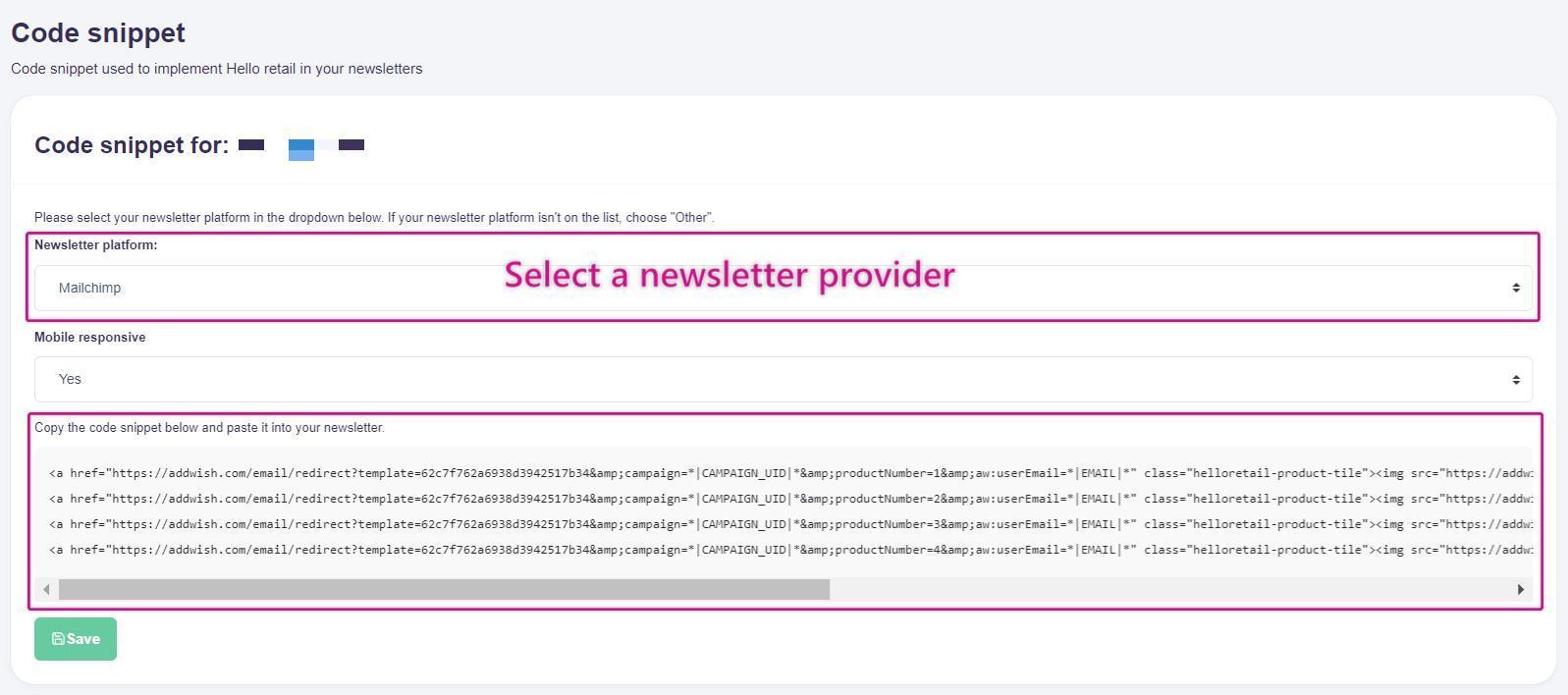 - In the Code section, you'll find the actual code snippet you have to copy and paste into your newsletter template. If you are using a newsletter provider like: MailChimp, Ubivox, Carmamail, Apsis, Loyaltymanager or Responsys - simply select it from the list and the code will be ready for you.