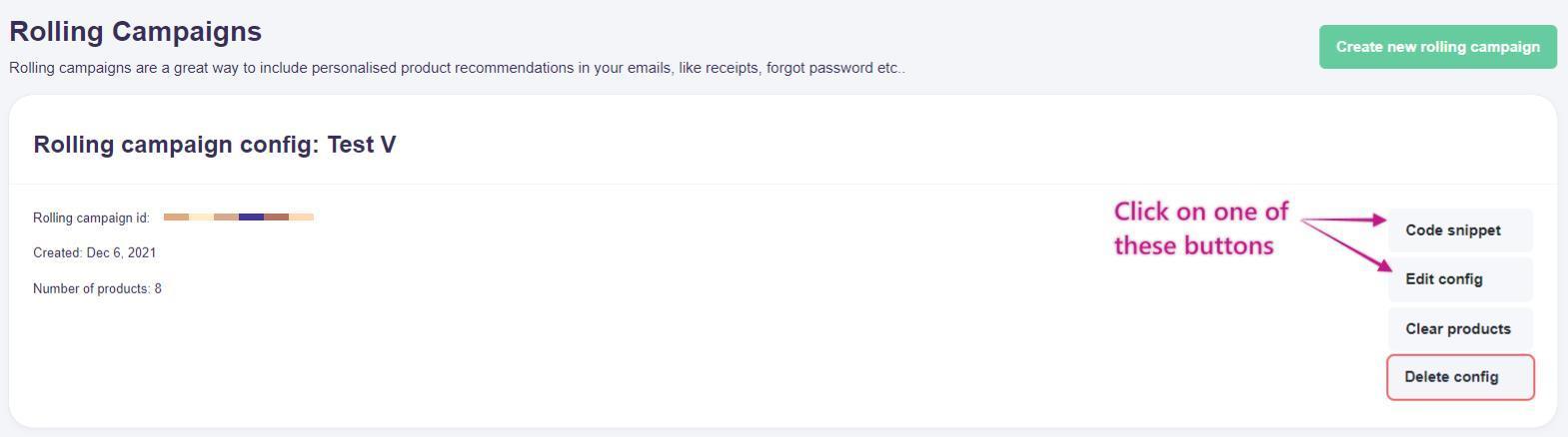 - Inside the campaign, then click on the Edit config button to access the overview of the code snippet. You can also access it by clicking on the Code snippet button.