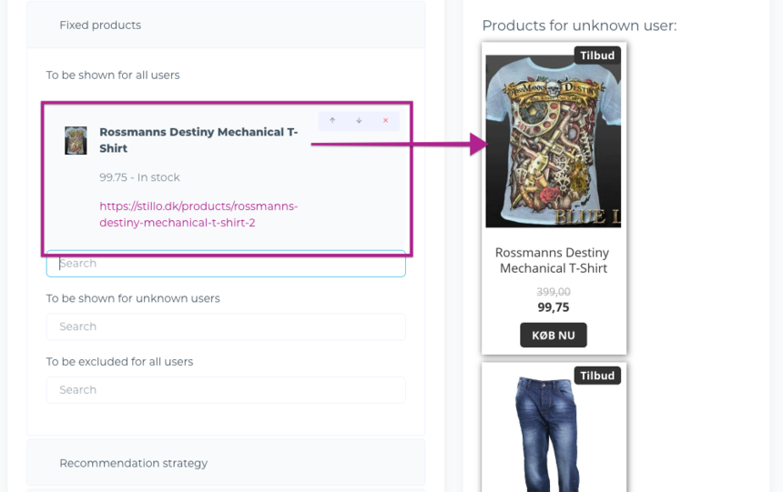 Under Fixed products, you are able to specify potential “fixed” products that you would like to be displayed to all users. This means that it is unaffected by their past browsing or purchasing history.