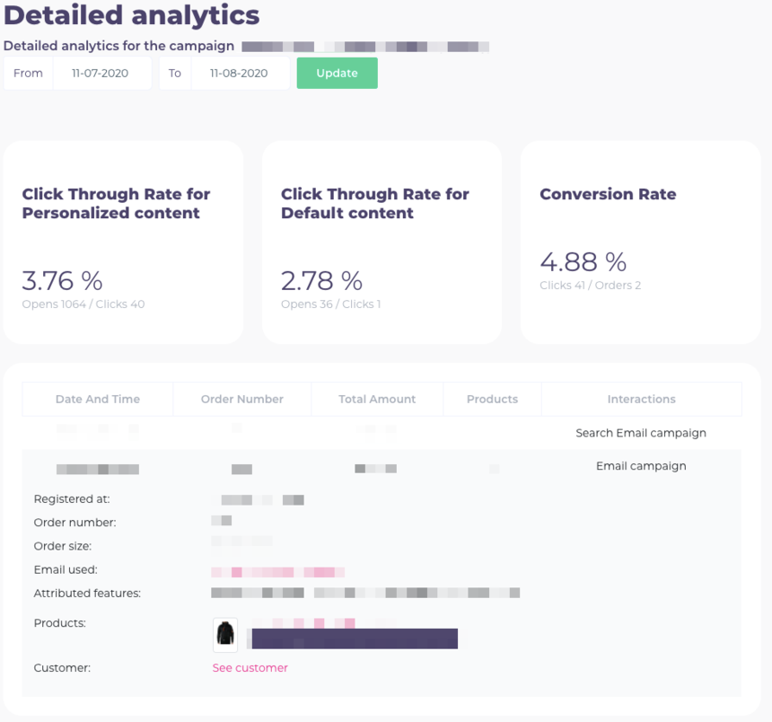 2. Orders: Contains purchases that were a result of your Newsletter Content campaign. If you click one of the orders on the list, you will see specific details about the selected purchase.