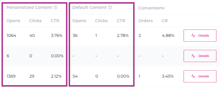 Opens and clicks are split up across Personalised content and Default content: