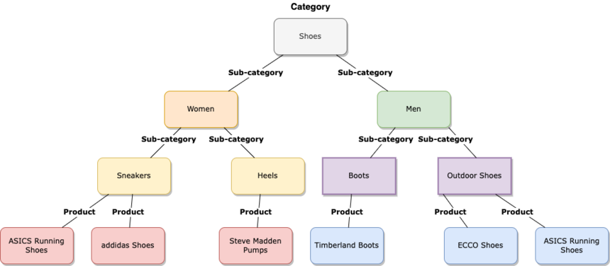 The example below illustrates the different categories. As you can see, it is also possible to have the same product but located in different categories. In this example, Asics shoes is both in Shoes > Men > Outdoor shoes and Shoes > Women > Sneakers.