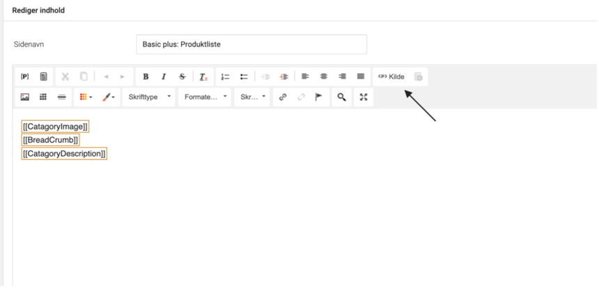 - After clicking on the ProductList, locate the "Kilde" button within the text editor.