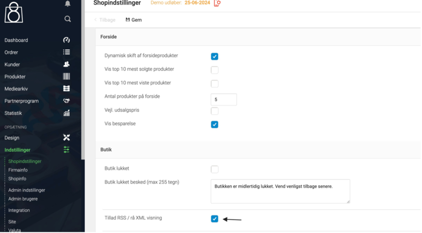 - Tick off “Tillad Rss / rå XML visning”