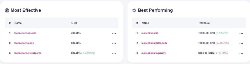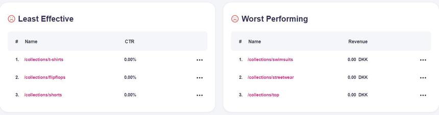 This section provides you with information about the pages with the highest click-through rate. That means the number of customers who clicked on a specific product compared to the total number of customers who visited the page.