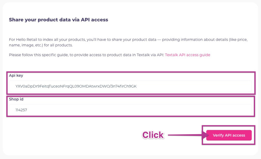Go back to your Hello Retail account and input the API key and shop ID. You find the shop ID in the top left corner on your Abicart webshop account page. Click Verify API access.