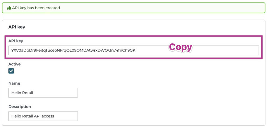 Mark off the checkbox under Active, enter a name such as Hello Retail, and add a description such as Hello Retail API access. Finally, click on the Add button.