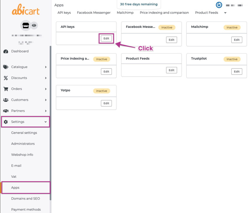 Inside the Apps view then navigate to API keys and click on the Edit button inside the box.