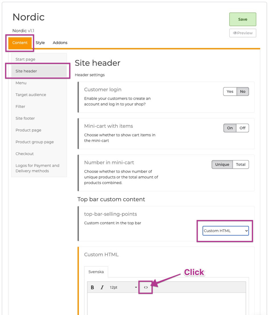 - Scroll down to Top bar custom content and choose Custom HTML from the drop-down menu. Then a Custom HTML box will appear beneath it.