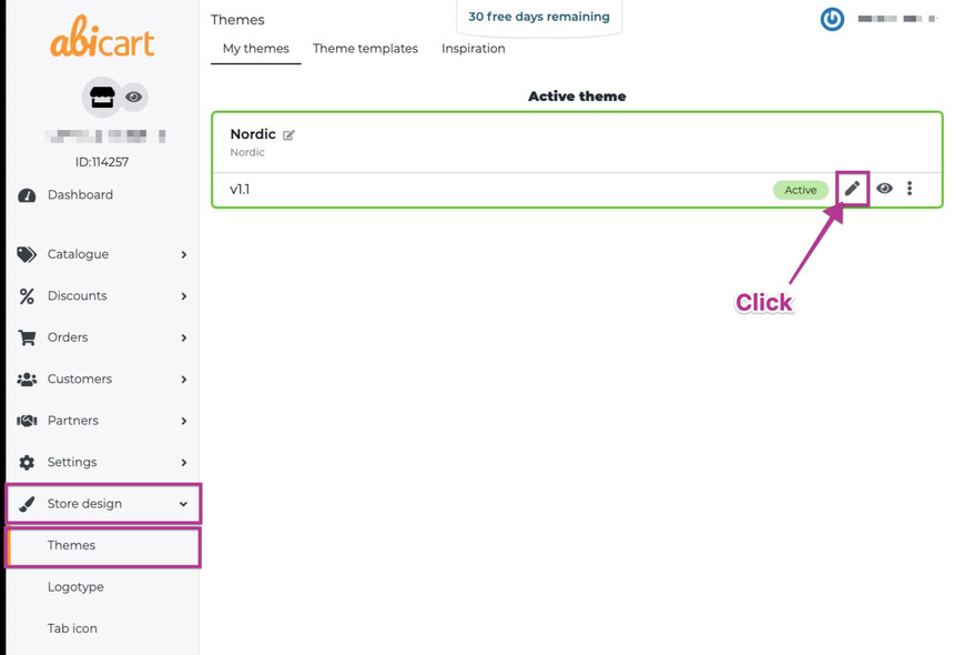 - Inside the Themes view then navigate and click on the Edit button on the active theme.