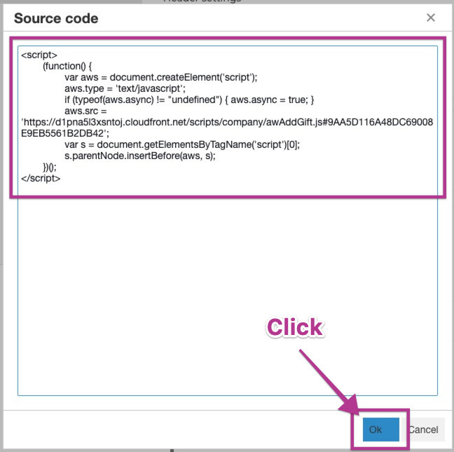 - Paste the Hello Retail JavaScript into the Source code box and click Ok.