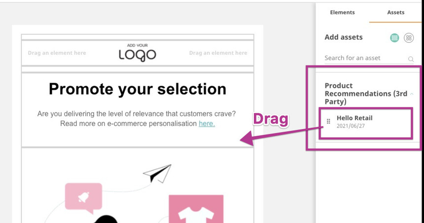 The Asset is now available for you to add to a newsletter design. While editing a newsletter, go to Assets and drag the Asset into the newsletter design.