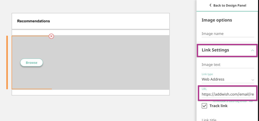 You now need to change two URLs for each of the four elements in the Asset; the image URL and the URL you're directed to when you click the image. To change the image URL, hover over an element and click the Browse button. Under Image URL, you'll see the URL.