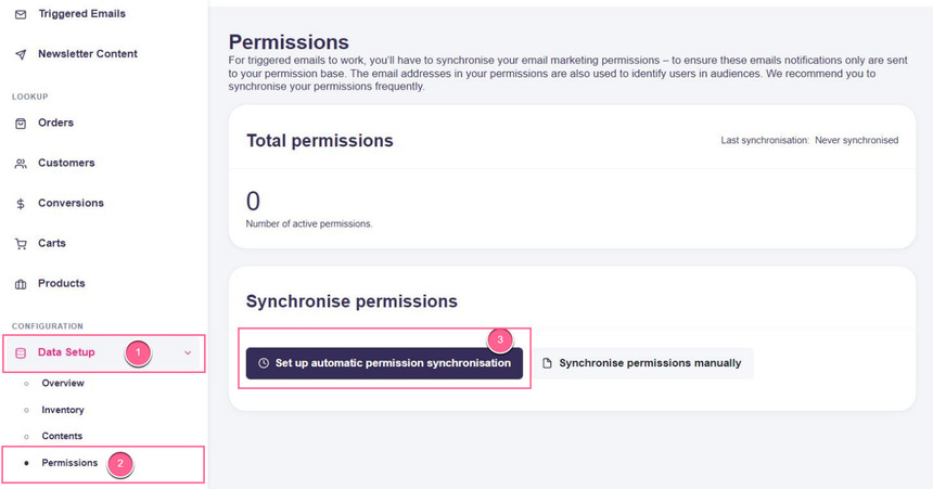 Step 1: In Hello Retail, go to Data Setup > Permissions, then click Set up automatic permission synchronisation: