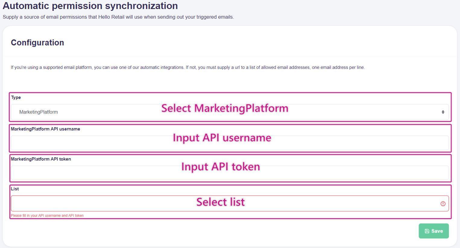 - The list field will start to load a drop-down list of your mailing/contact lists from your MarketingPlatform account - once this is loaded, please select the list that you want to synchronise with.