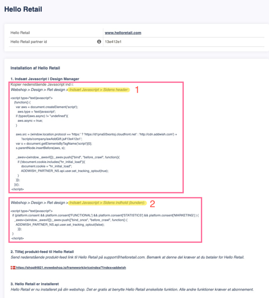 - In the footer: Copy the code snippet listed as number 2 as seen below, to your clipboard. The "Hello Retail partner id" shown in the screenshot is no longer required.