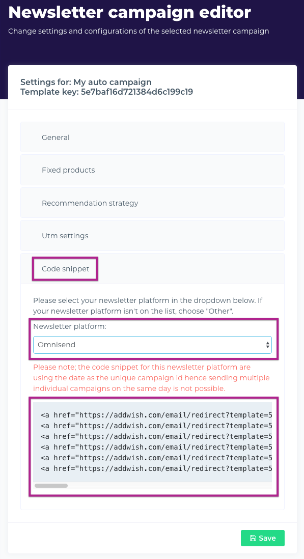 Step 4: You will now be able to select fixed products, these will always be shown and set a "Recommendation strategy" (You can also leave it as default). Now click on the "Code snippet" tab and select "Omnisend" as Newsletter platform and copy the code snippet below as shown.