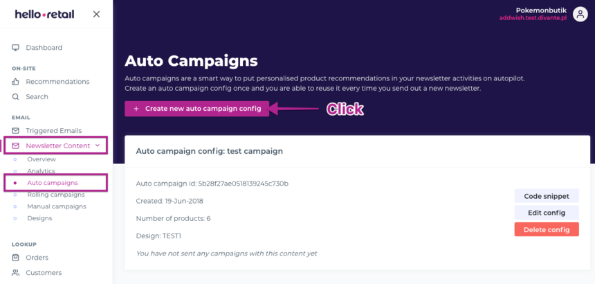 Step 1: Firstly, log into your Hello Retail account here and create an auto campaign for your product recommendations that should be in the newsletter. (If you already made a design you can skip to Step 4)