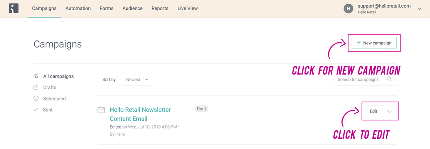 Step 3: Press "Edit" if you already have an existing campaign or press "+New campaign" if you like to create a new newsletter.