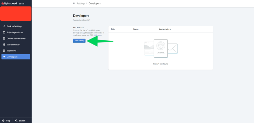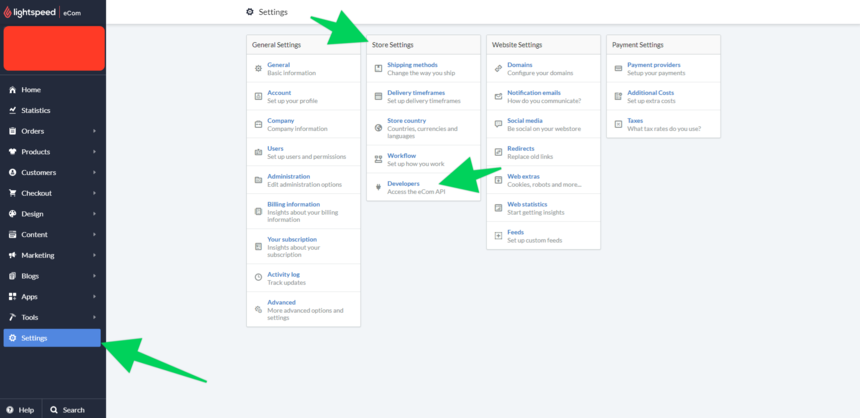 To get the API credentials, navigate to the Settings > Store Settings > Developers section in your Lightspeed Dashboard: