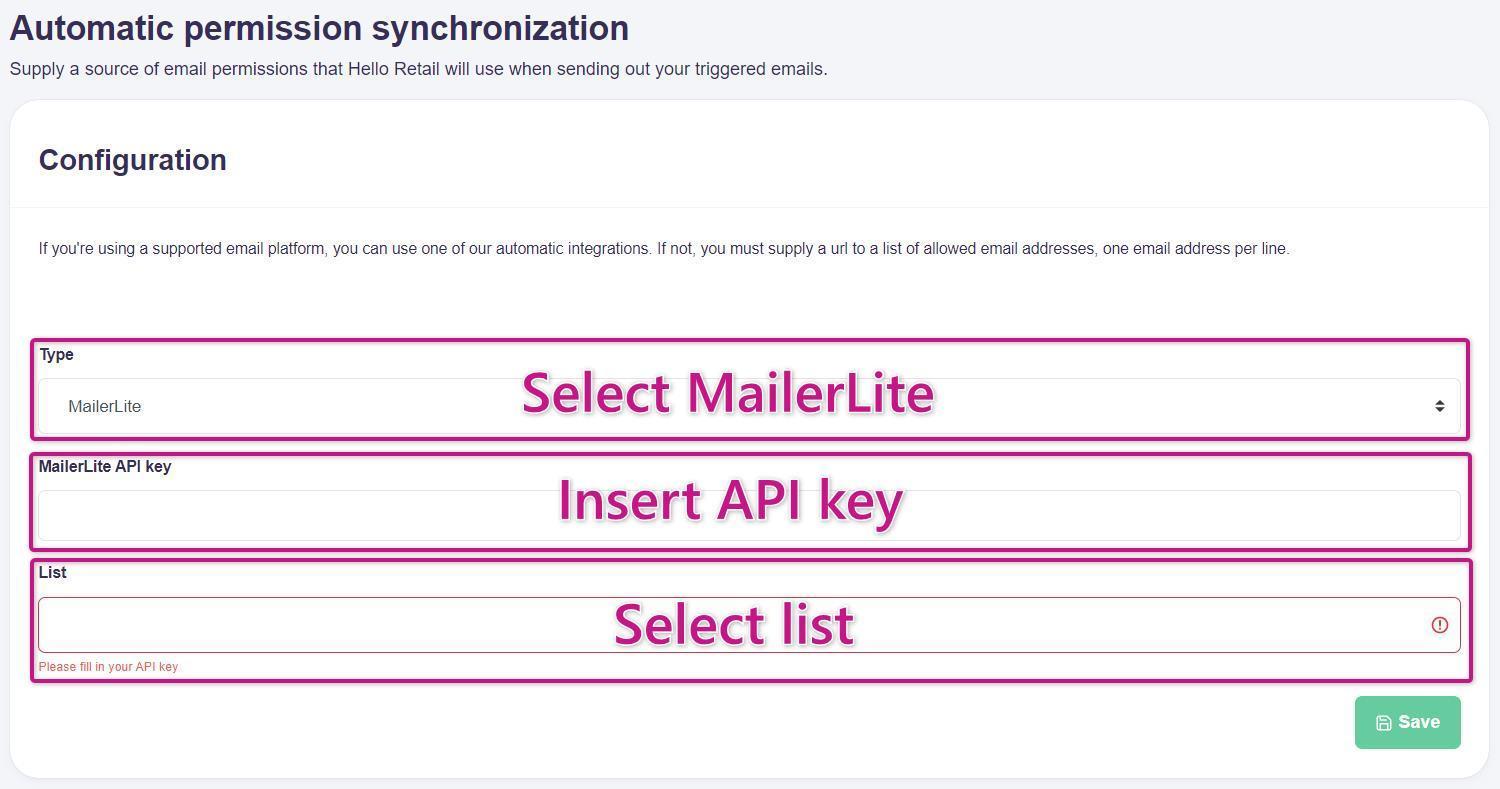 Inserting the MailerLite API Key into your Hello Retail Account¶