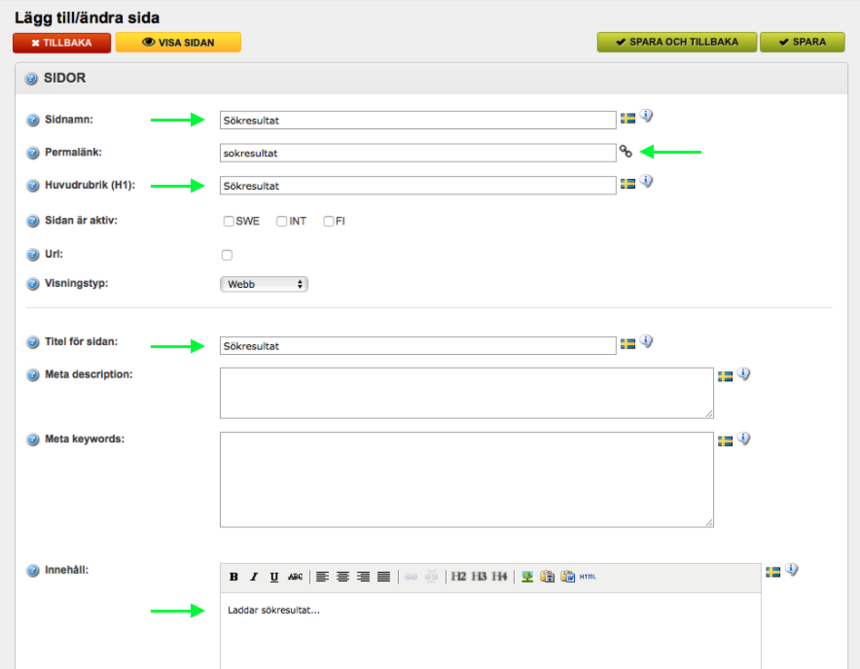 Also set a headline (”Huvudrubrik”) and a title. To be able to save the page, it also needs some content (”Innehåll”). This will be removed by our script when we insert the search results, so you can just add anything. For example ”Laddar sökresultat...”, or just a dot.