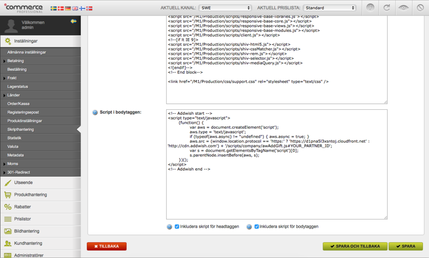 Step 3: Tick the box Inkludera skript för bodytaggen and copy/paste your Hello Retail JavaScript and a cart tracking snippet into the Script i bodytaggen field: