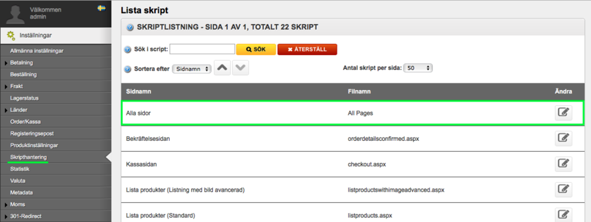 Step 2: Navigate to Inställningar > Scripthantering and click edit on ”All pages”.