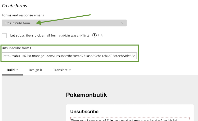 Step 5: In the form's drop-down you have to select "Unsubscribe form" to edit and get information about your list specific forms.
