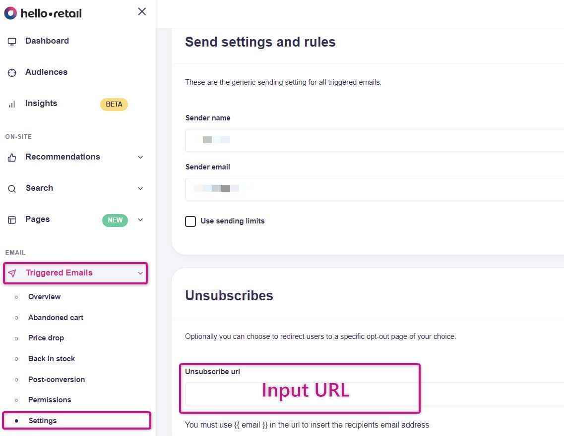 Step 6: Now you'll have to navigate to Triggered emails > Settings > Unsubscribes in your helloretail account to paste in the Unsubscribe form URL from Mailchimp.