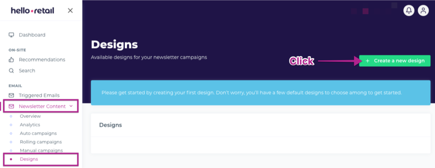 Log in to your Hello Retail account and go to Newsletter Content -> Designs and click Create a new design.