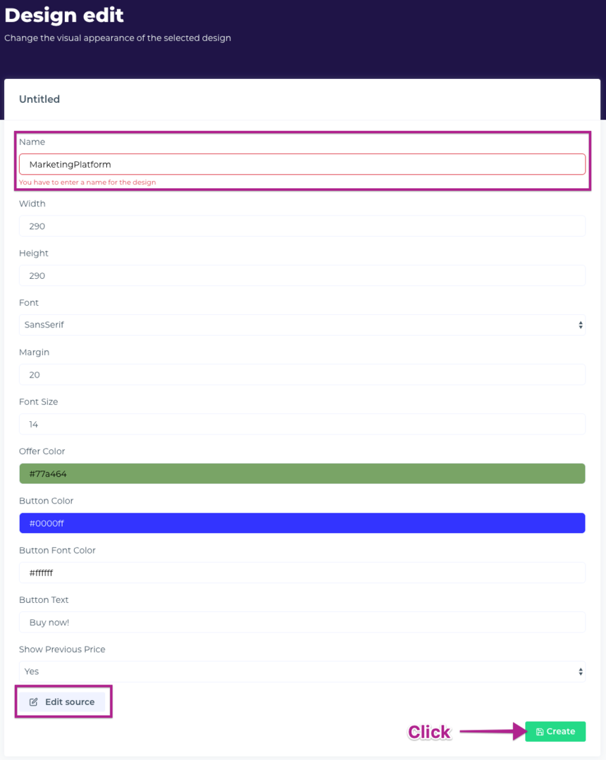 On the next page, you can customize the design to make it fit the design of your shop and newsletter. First, you'll give the design a name, and then you can change the size, font, font size, colors, and the text and color of the buy button.